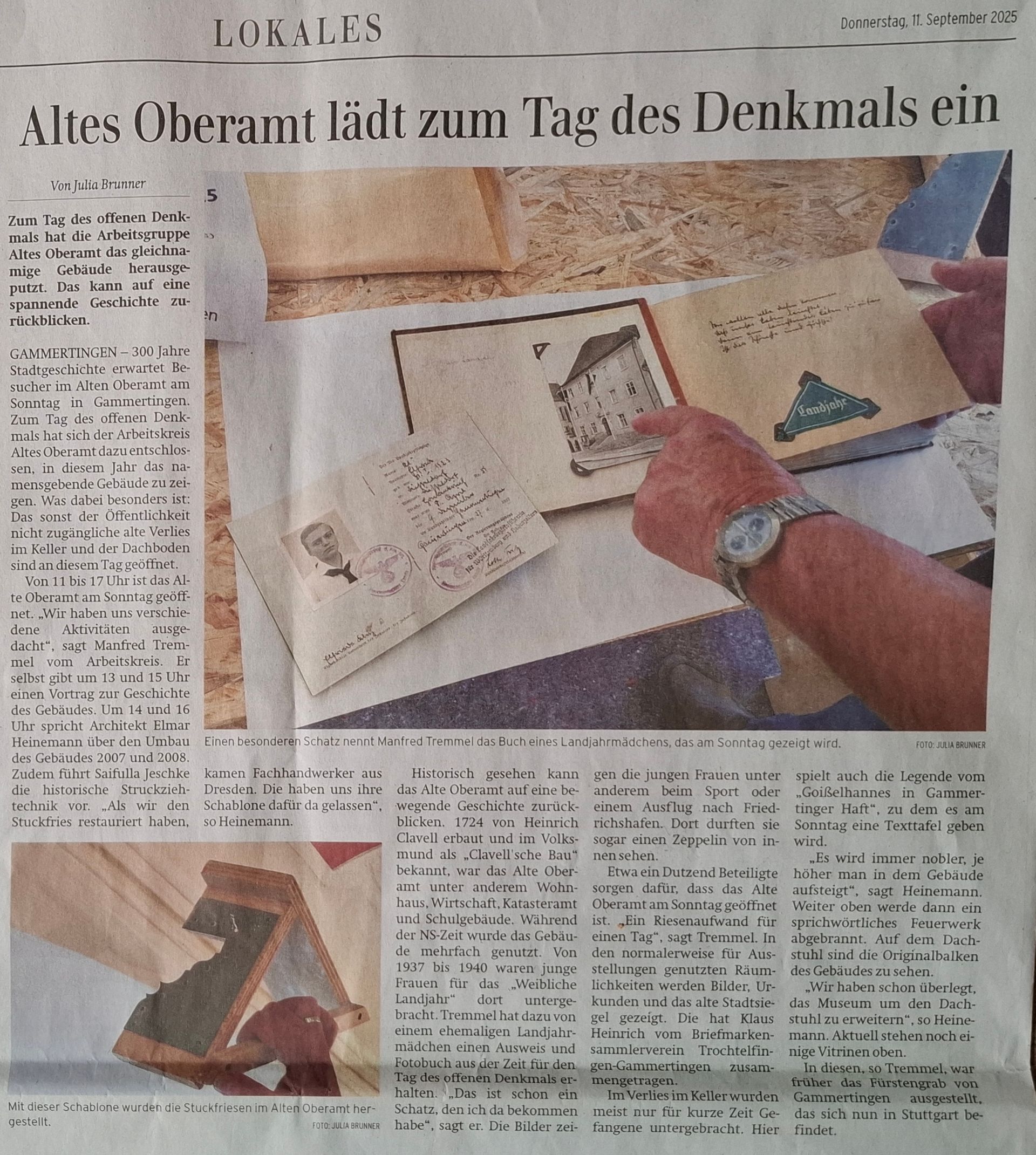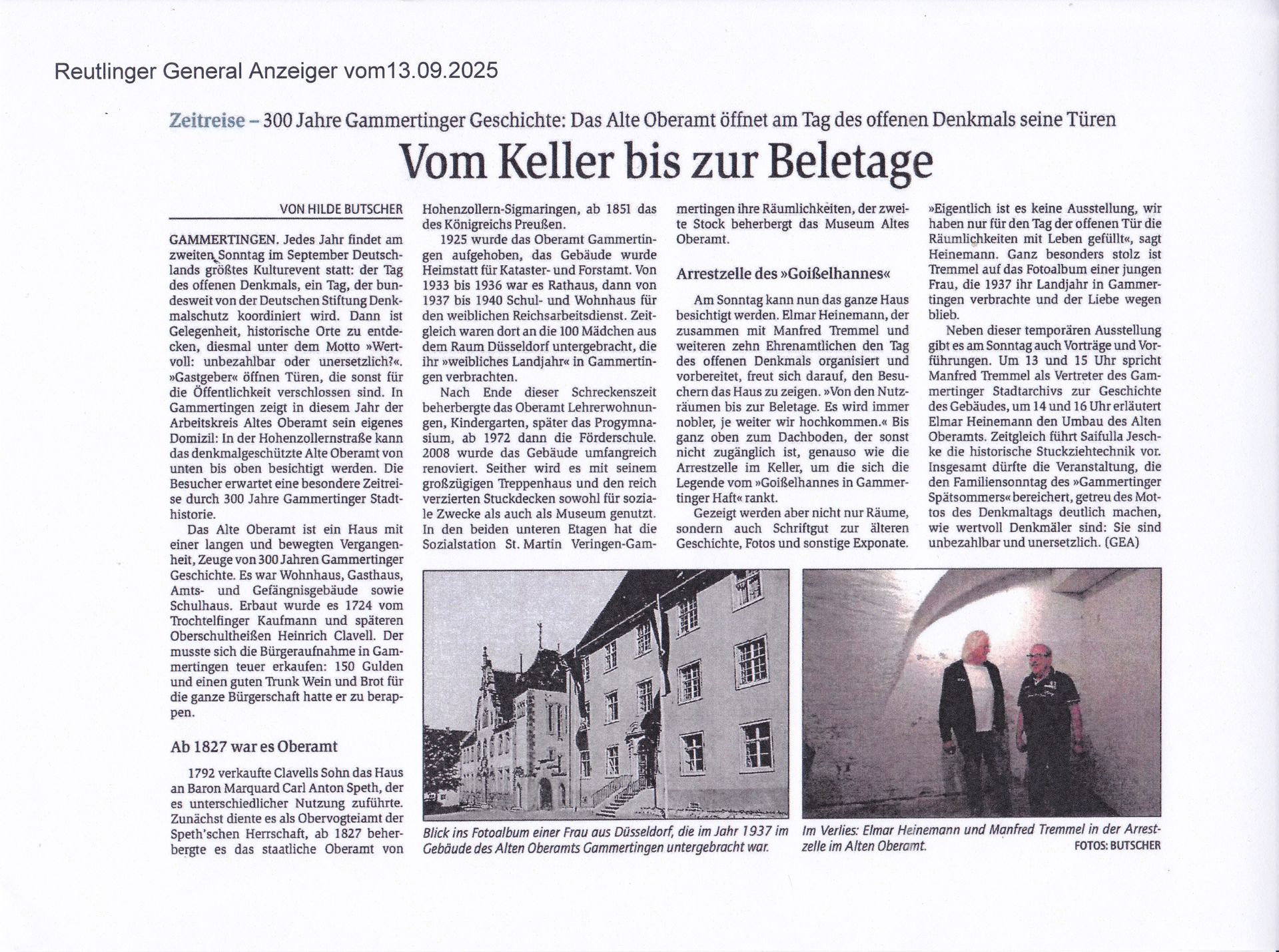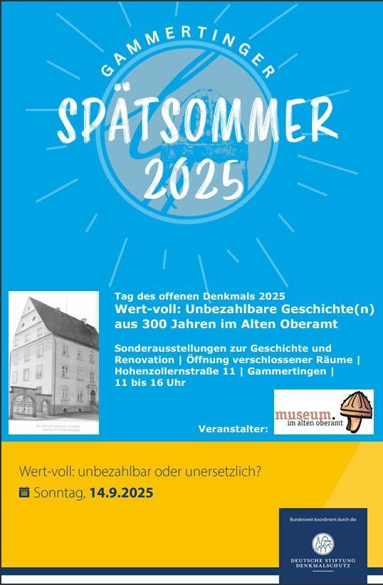Am Tag des offenen Denkmals 2025 und im Rahmen des ersten "Gammertinger Spätsommers" öffnete das Alte Oberamt in Gammertingen seine eigene Türen und lud die Besucher ein, auf eine besondere Zeitreise zu gehen. Unter dem Motto „Wert-voll: unbezahlbar oder unersetzlich?“ der Deutschen Stiftung Denkmalschutz konnten Gäste nicht nur die Museumsräume erkunden, sondern auch selten zugängliche Bereiche entdecken – etwa den geheimnisvollen Dachboden oder die frühere Arrestzelle im Keller, wo jeweils eine Sage der Stadt nachgestellt worden war.