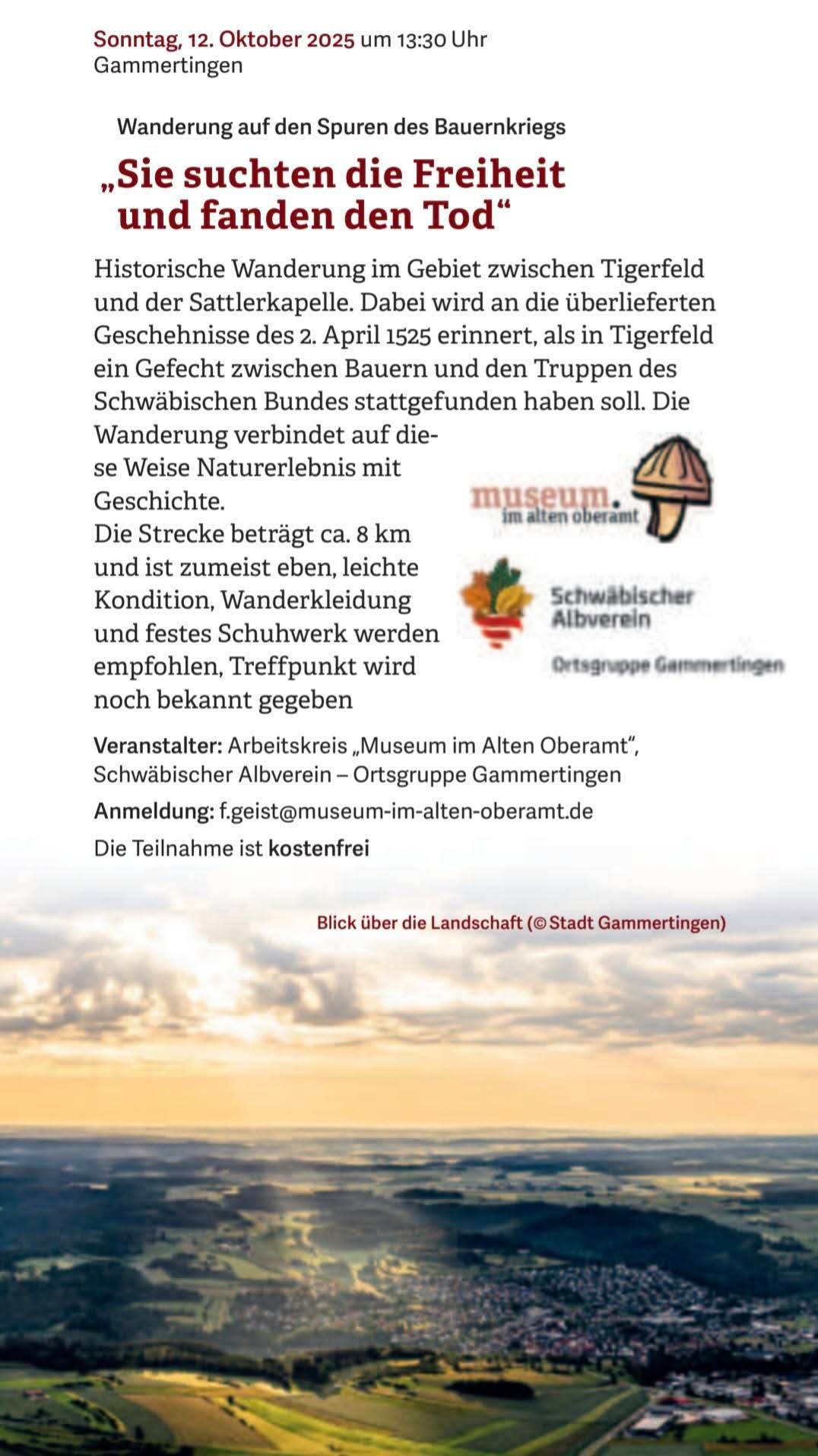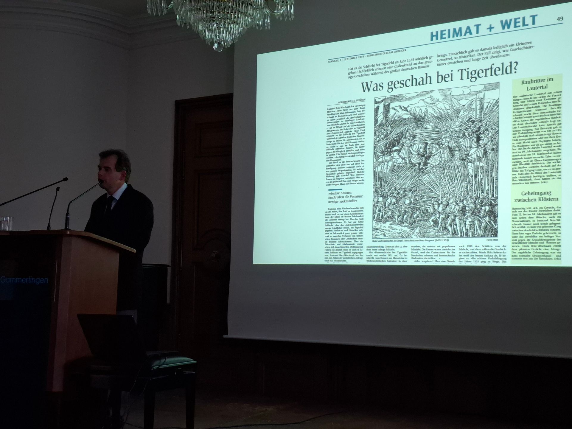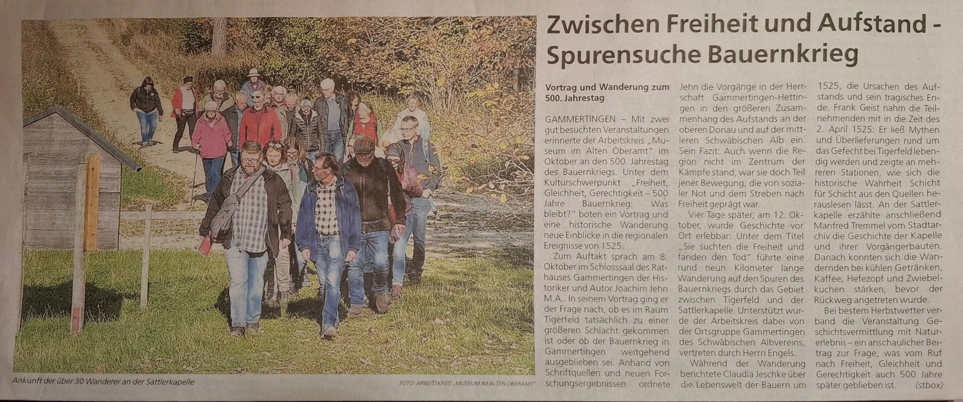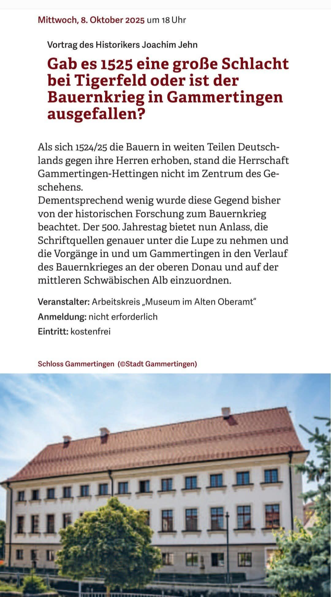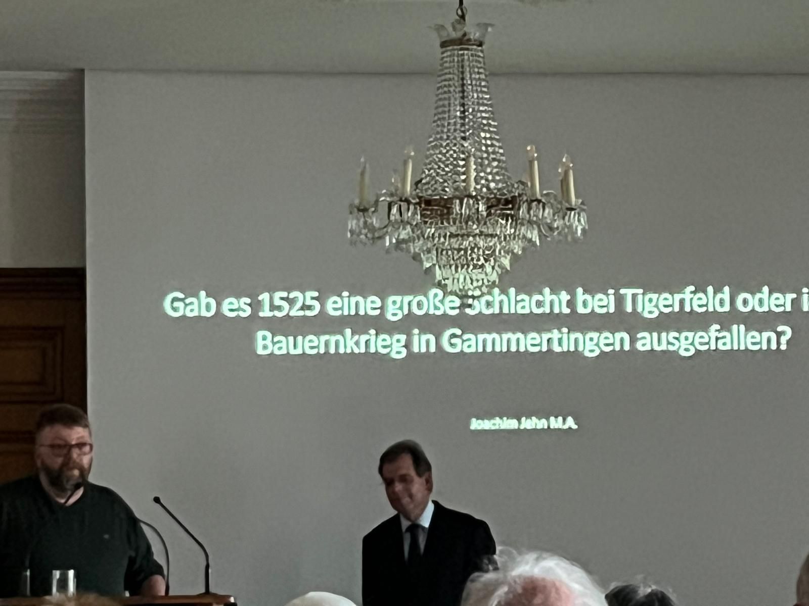Am 8. Oktober sprach der Historiker Joachim Jehn M.A. im Schlosssaal Gammertingen über die Rolle der Herrschaft Gammertingen-Hettingen im Bauernkrieg. Auch wenn die Region nicht im Zentrum der Kämpfe stand, zeigte er, wie stark die Menschen damals von sozialer Not und dem Wunsch nach Freiheit geprägt waren.