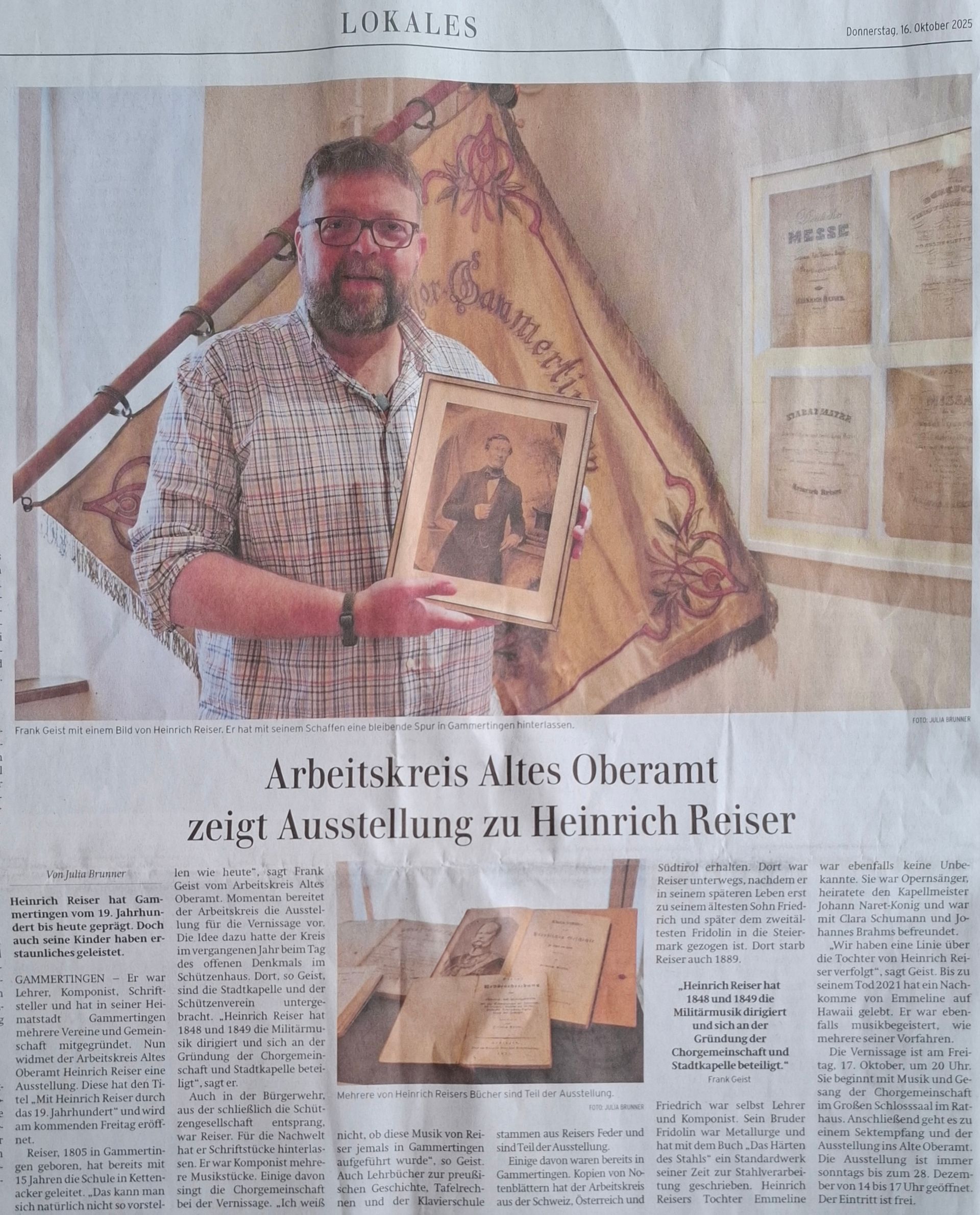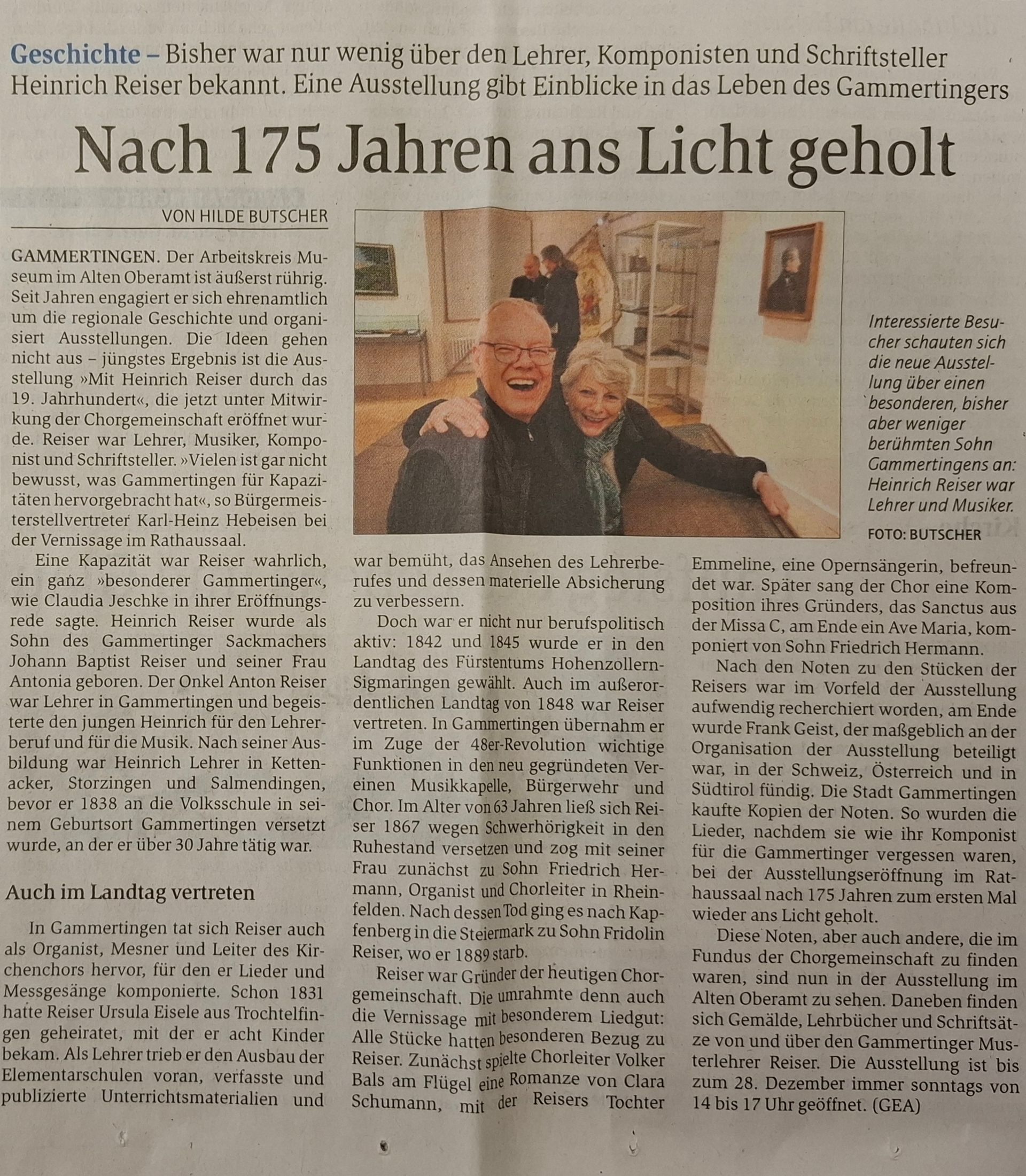 "Mit Heinrich Reiser, jenem Musterlehrer, Musiker, Komponisten, Politiker, Vereinegründer, Autor und unermüdlichen Bürger des Gemeinwesens, der, ohne es vielleicht selbst zu ahnen, durch sein Wirken die unterschiedlichsten Fäden der Epoche zusammenhielt, während seine Kinder – die einen, ganz dem Geist der Musik verpflichtet, in Mannheim und Frankfurt zwischen Clara Schumann und Johannes Brahms verkehrend; die anderen, tatkräftig und zielstrebig, in der habsburgisch-steirischen Montan- und Stahlindustrie von Kapfenberg Bedeutendes leistend und sich dort in die höchsten Gesellschaftskreise einfügend; und wieder andere, das väterliche Erbe pädagogisch und musikalisch in der Schweiz, in Rheinfelden, weiterführend – das Bild einer Familie zeichneten, die auf ihre Weise die gesamte Breite der damaligen Welt spiegelte, während rundherum die großen Kräfte Europas, von Napoleon über die Revolutionen von 1848/49 bis hin zur Reichsgründung, ihre unübersehbaren Spuren hinterließen, und all dies begleitet von weiteren Exponaten aus Gammertingen und Umgebung, die wie kleine Fenster in eine große, bewegte Zeit geöffnet sind – durch das 19. Jahrhundert.“