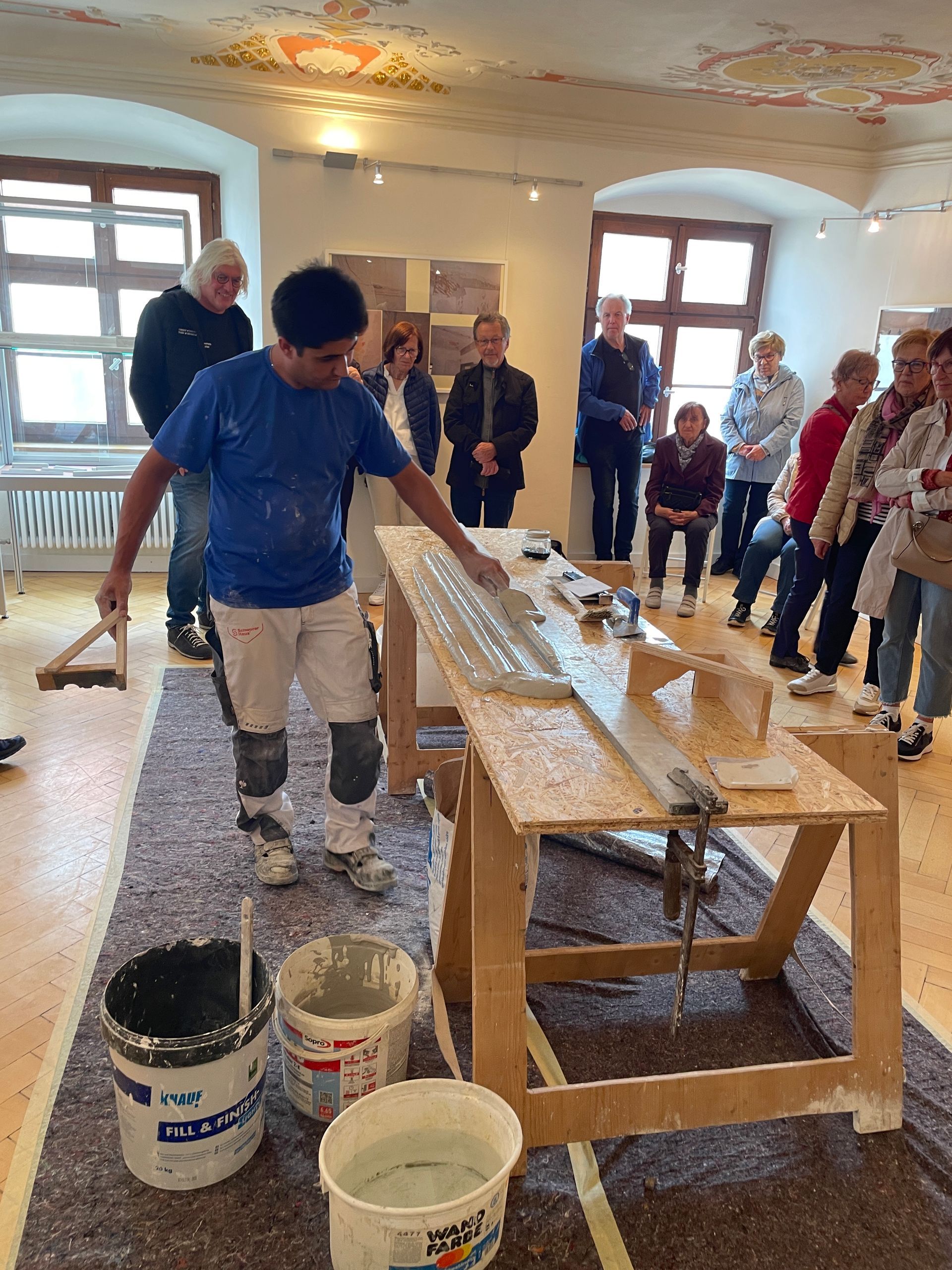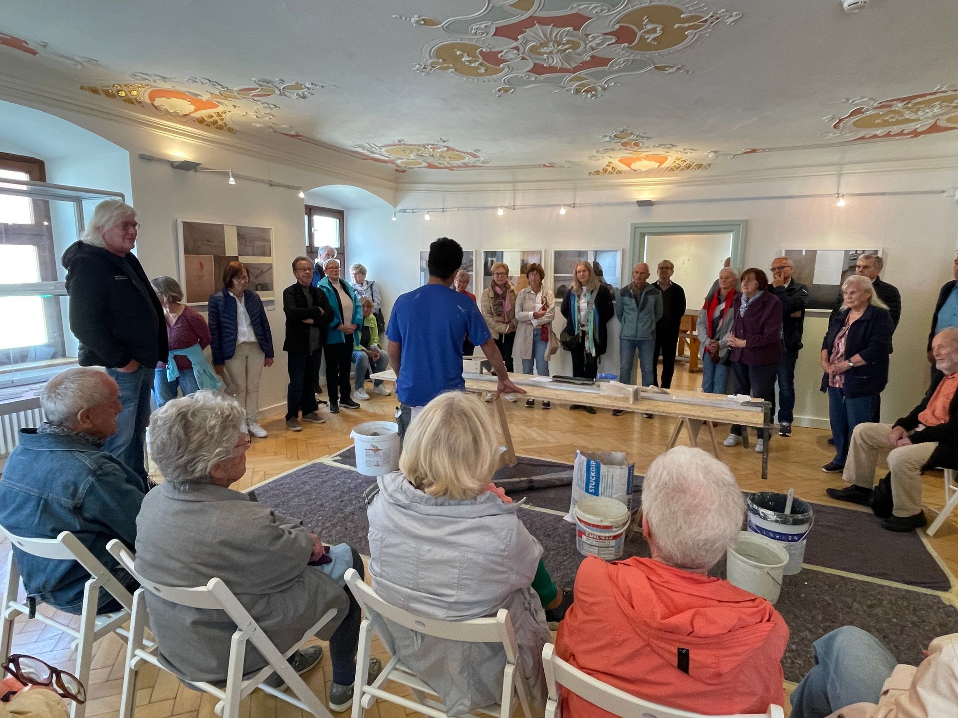 Herr Tremmel vom Stadtarchiv hielt Vorträge zur Geschichte des Gebäudes. Herr Heinemann referierte über die Renovierung der Räumlichkeiten aus dem Jahr 2008. Herr Jeschke zeigte schließlich praktisch, wie der Stuck für die Decken auf althergebrachte Weise gezogen wurde.